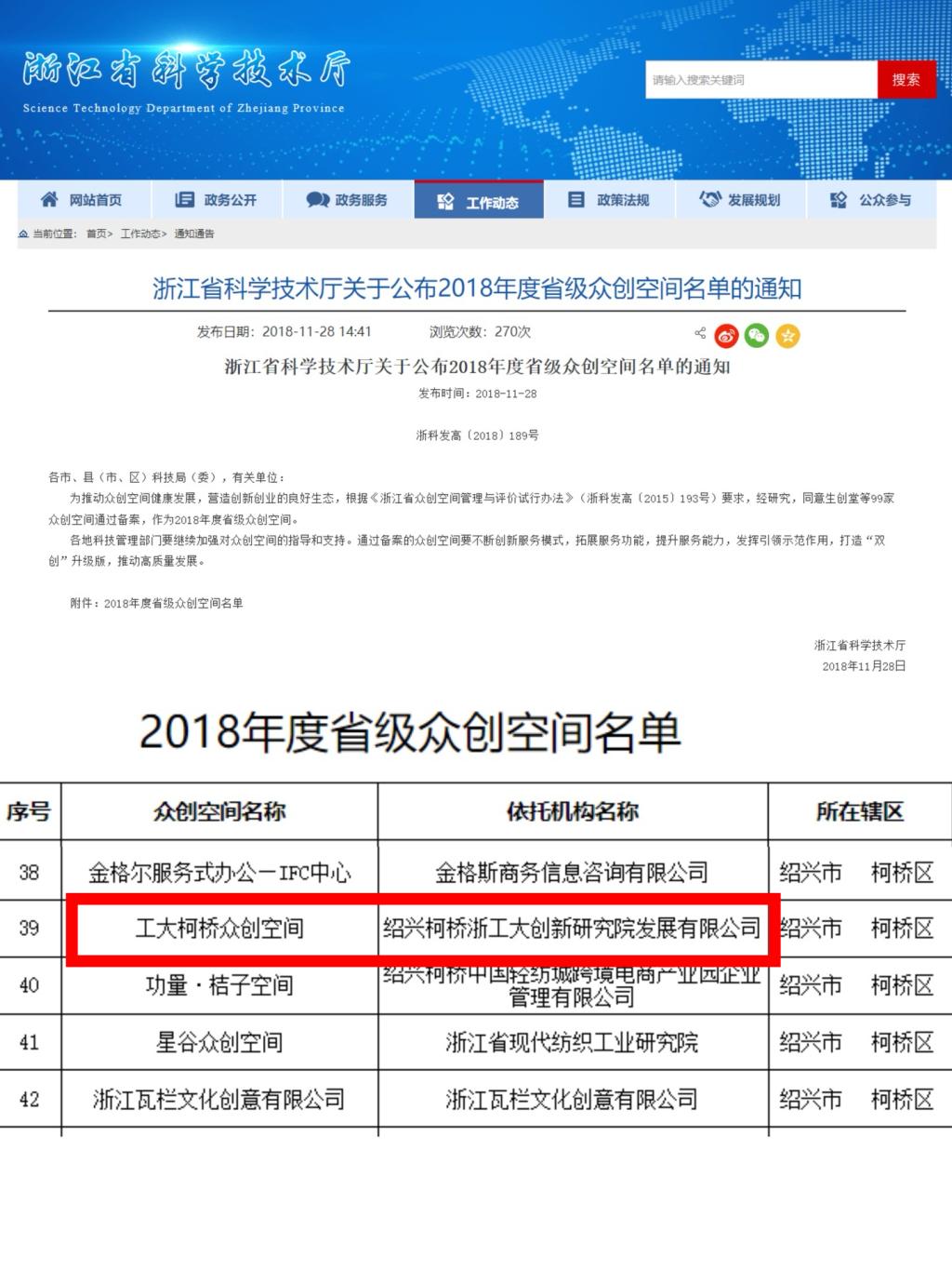 2018年11月,浙江工业大学柯桥创新研究院申报的工大柯桥众创空间,获得“省级众创空间”认定。