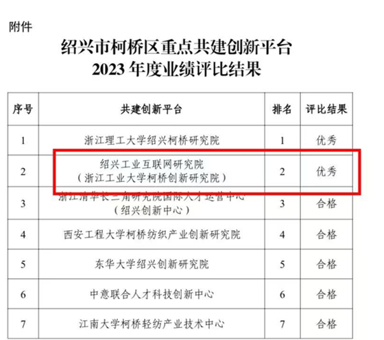 研究院作为绍兴市柯桥区重点共建创新平台在2023年度业绩评比中被评为优秀